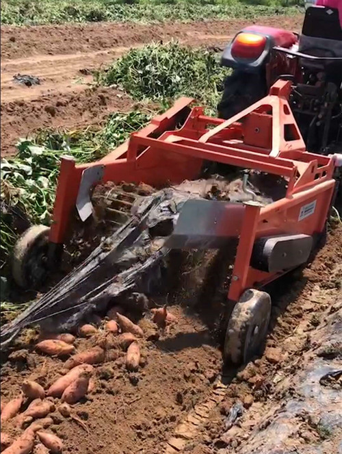 山東曹縣魯富機(jī)械紅薯收獲機(jī)與小四輪拖拉機(jī)傳動(dòng)軸連接,經(jīng)主傳動(dòng)軸上偏心塊、連桿帶動(dòng)挖掘鏟作前后往復(fù)運(yùn)動(dòng),再由傳動(dòng)軸左端齒輪帶動(dòng)過(guò)橋軸上變速齒輪,并改變傳動(dòng)方向,再經(jīng)鏈條帶動(dòng)分離排鏈主傳動(dòng)軸,并由主傳動(dòng)軸兩端偏心塊帶動(dòng)振動(dòng)篩上下抖動(dòng)。在拖拉機(jī)的牽引下,使挖掘鏟挖掘出來(lái)的馬鈴薯(大蒜、地瓜等)鋪放在分離排鏈上,在分離排鏈的轉(zhuǎn)動(dòng)下土落在分離排鏈下方,馬鈴薯(大蒜、地瓜等)和未落下的土塊,在分離排鏈上面落在振動(dòng)篩上,再次清選分離后集中鋪放在機(jī)后地面上。